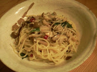 しいたけ、えのき、しめじ、など家にあるキノコ類を適当な大きさに切り、ニンニクのみじん切り、鷹の爪、和風だし、醤油、酒をどんぶりに突っ込んでラップしてレンジで3分。すべて目分量。たまたま冷蔵庫にしそがあったので、これもまぜて。あとは茹でたパスタと和えるだけという、超お手軽なパスタです。パスタのゆで時間を除けば、調理時間は正味5分程度。